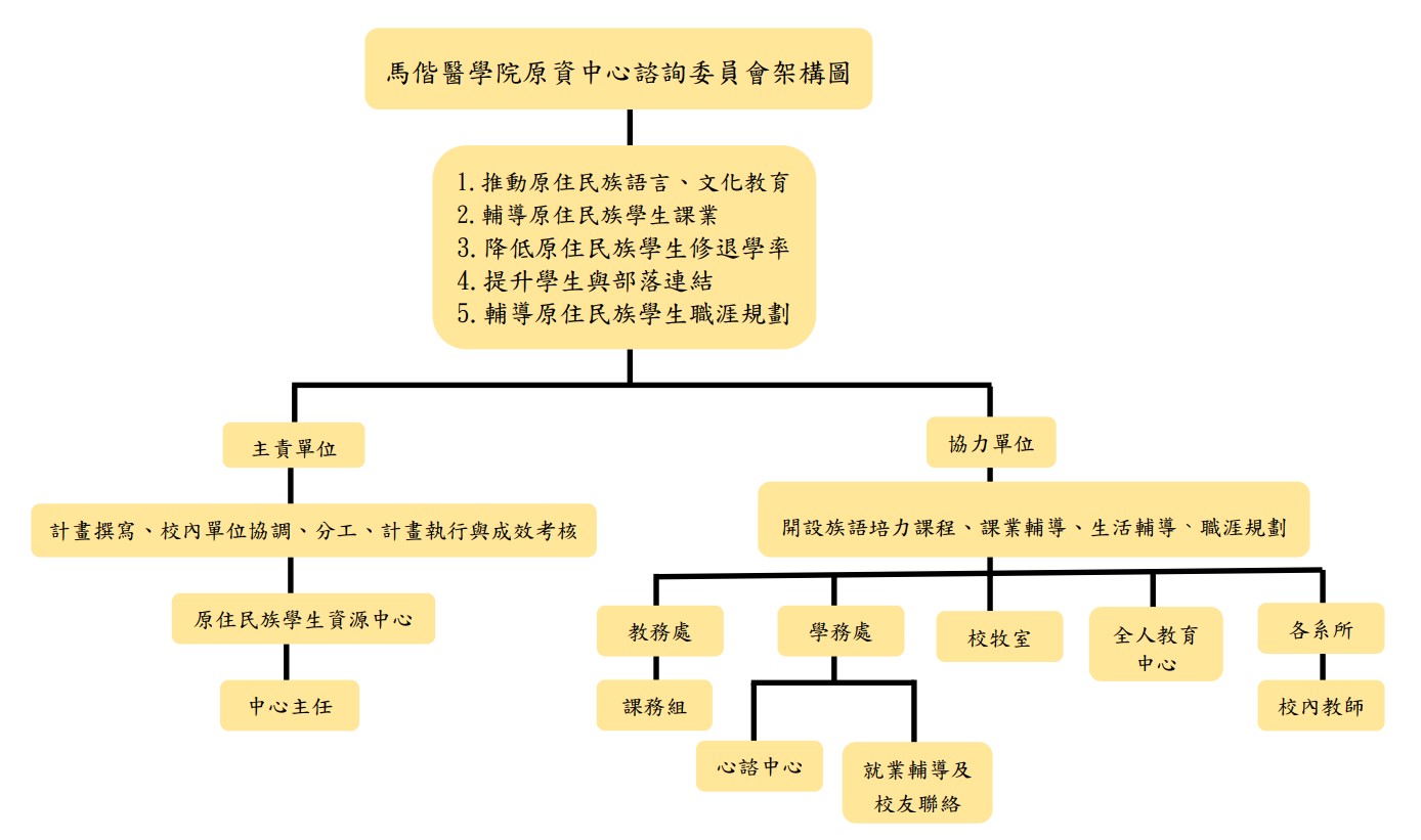 關於原資中心 2026-01-30 CALENDAR 活動行事曆 —— 業務快速導覽 —— 中心目的 中心特色 組織成員 諮詢委員 中心位置 相關連結 MISSION 中心目的 提供原住民族學生教育相關之各項服務,讓原住民族學生在生活、學習及就業上能獲得各項協助與關懷,並使學生在原資中心內與其他來自不同族群與地方的原住民族學生進行更深入的交流,達到拓展學生視野,培養自主學習、樂觀自信、參與社會、服務人群及共享美好之公民素養,創造多元文化友善校園環境,使師生認識原住民族文化之美。 ▲ 回到導覽 FEATURES 中心特色 本校結合教務處E-portfolio及秘書室馬偕共學園課外活動學習認證制度,建立原住民同學之個人化資訊系統,並配合導師制度及學務處生輔導資源(如生活輔導組、心理諮商中心等),以協助導師及輔導員了解其學習及生活適應情形,俾利及時提供輔導與協助。 本中心亦請各系協助當有原住民籍學生擬休學時,需先與本中心專輔人員諮詢,了解學生休學原因,將邀情相關師長依據原因提出解決方案,以降低學生的休學率。另將請系所及教務處提供各項學習數據、成績預警等資訊,主動介入關懷與輔導。並且將由教務處、學務處、校牧室及各教學單位建立橫向協調機制,定期召開工作小組會議,分別協助及精進原住民同學以下事項: 教務處:課業成績預警與學業輔導。 學務處:建立原民生基本資料、辦理原民生生活輔導。 校牧室:提供具基督信仰同學之團契生活與信仰造就。 各教學單位:藉由導師制度進行原民生職涯與生活輔導。 ▲ 回到導覽 STRUCTURE 組織結構與成員 本中心根據「原住民族教育法」第25條規定,原資中心編制主任1人、專案計畫助理1名。 中心主任:吳子維學務長(#1130)-綜理督導原住民族學生資源中心。 中心專員:林詩怡專任助理(#1910)-原住民族學生輔導工作及行政事務聯繫,處理相關行政事務、活動辦理與中心空間管理。 ▲ 回到導覽 COMMITTEE 諮詢委員會 本中心依據「教育部補助大專校院原住民族學生資源中心要點」第5點規定,應成立諮詢委員會或其他諮詢輔導機制,提供專業建議,已設置諮詢委員會,委員人數為7人,提供推動方向與精進工作策略建議,組織架構說明如圖所示。 ▲ 回到導覽 LOCATION 中心位置 📍 辦公地點:原住民資源中心與校牧室 ▲ 回到導覽 RESOURCES 相關連結 ▲ 回到導覽