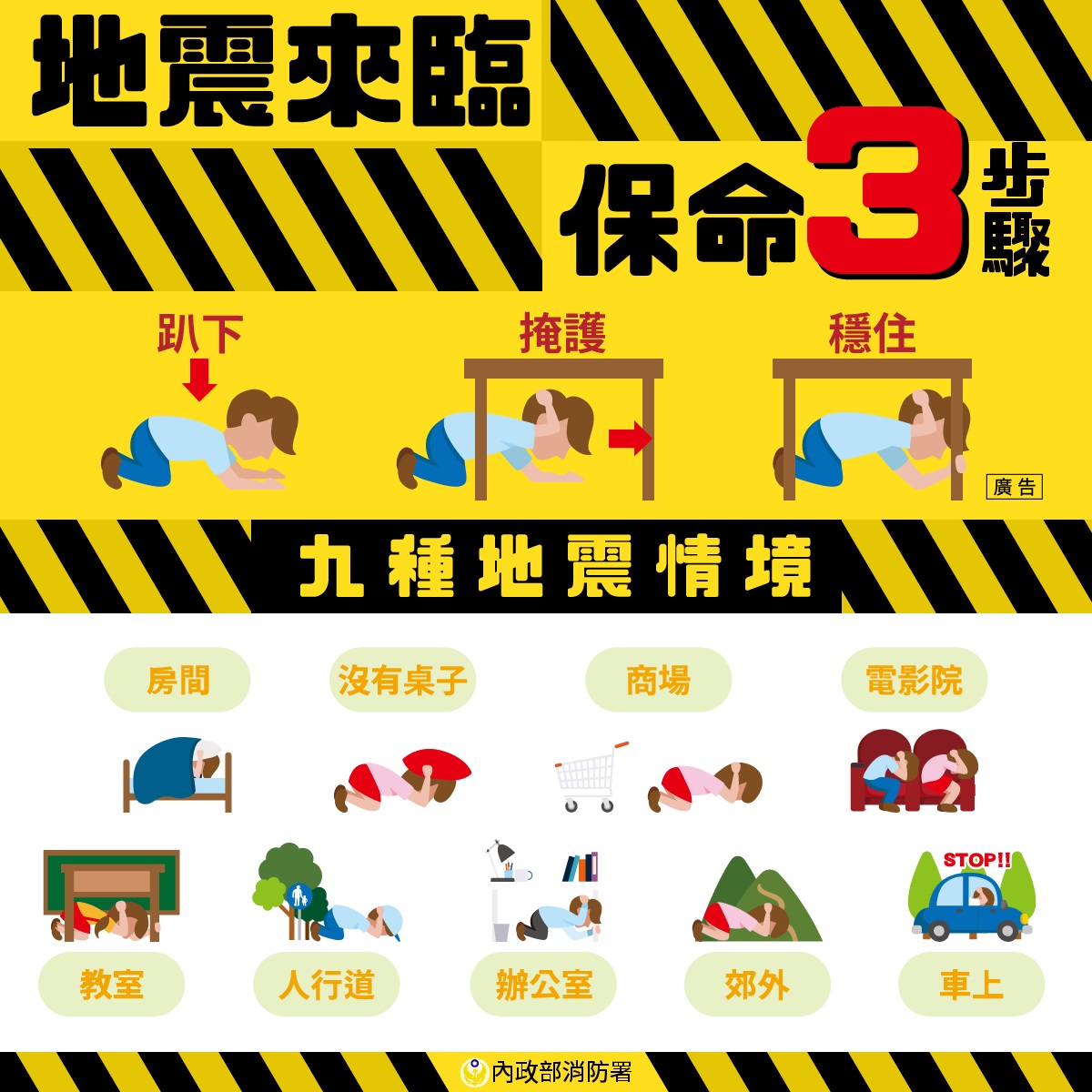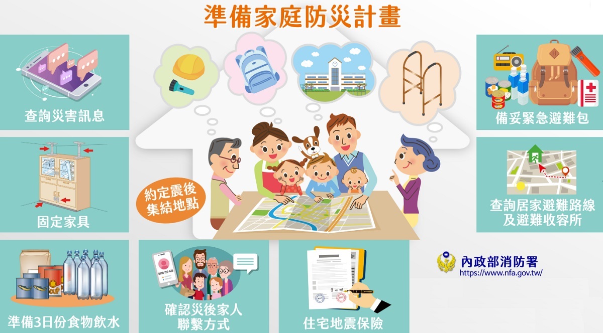 防災避難教育 2026-04-01 教育宣導 相關連結內政部消防署教育部防災教育資訊網相關檔案: 校園城鎮韌性(防空)疏散避難演練參考指引「當危機來臨時- 臺灣全民安全指引」電子書下載網址互動式網頁網址